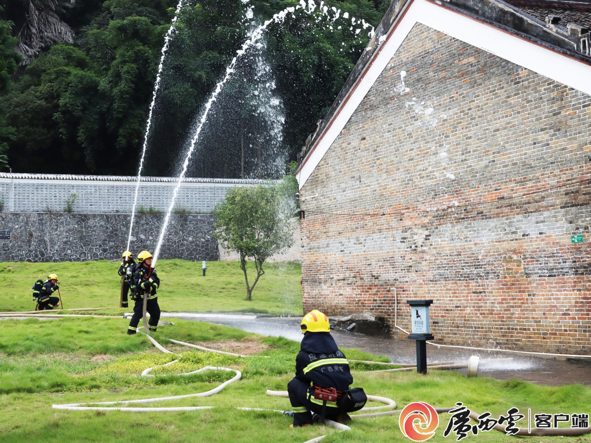 在土司练兵场,消防救援人员向文旅职业人员演示消防水带铺设办法。本文图片由忻城消防供图