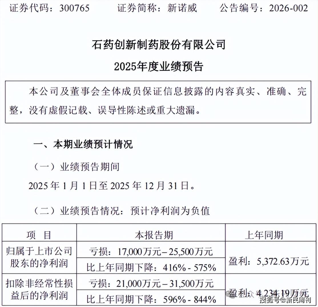 近日,石药创新制药股份有限公司(300765.SZ,以下简称“新诺威”)发布了重要的公告,公司预计2025财年归母净利润将出现亏损,金额在1.70亿元至2.55亿元之间。这是新诺威自2019年登陆创业板以来的年度“首亏”,相比2024年同期0.54亿元的盈利,同比降幅高达416%至575%。扣非净利润的预计下降则更为显著,或达596%至844%。